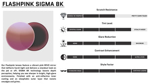Our Flashpink lenses feature a vibrant pink REVO mirror that deflects harsh light and delivers a standout look on the job or off. SIGMA 8K technology boosts depth erception, helping you see sharper in bright, high-glare environments. Finished with an anti-reflective inner coating and an oleophobic outer layer that resists smudges and grime.