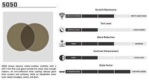 5050 lenses balance indoor-outdoor visibility with a CAT-I tint that cuts glare outside but stays clear enough indoors. An anti-reflective inner coating reduces glare from screens and surfaces, while an oleophobic outer layer repels smudges, sweat, and dust.